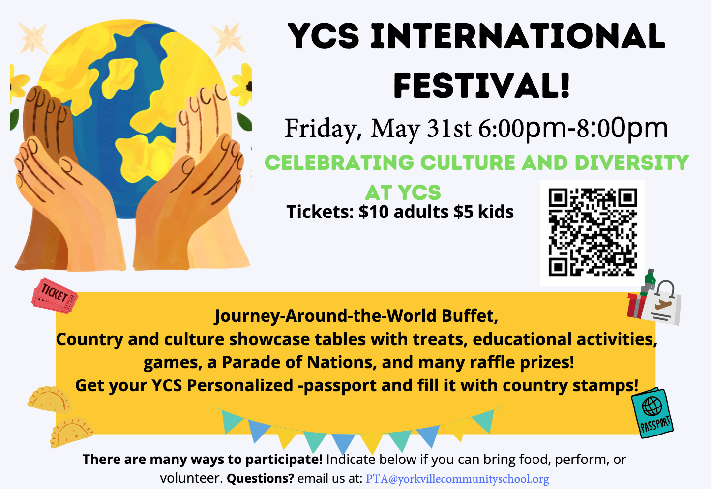 Friday, May 31, 6–8 PM Celebrating Culture and Diversity at YCS Tickets $10 for adults, $5 for kids Buy your tickets here